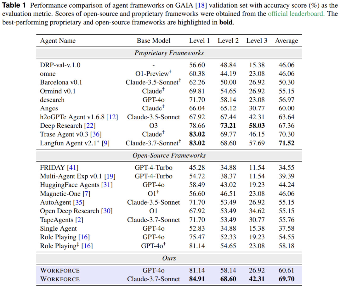 港大、camel-ai 等多家机构联合提出了一种名为新的名为 Workforce 的创新多智能体框架,以及配套的 OWL(Optimized Workforce Learning)训练方法,在通用 AI Assistant 的标杆基准测试 GAIA 上取得了 69.70% 的准确率,不仅刷新了开源系统的最佳纪录,更是超越了多家商业系统以及 OpenAI Deep Research 的开源方案。