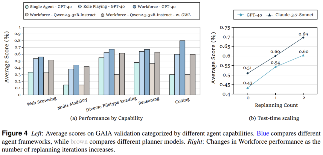 测试时自我纠错:通过 Workforce 设计的任务失败时触发的自我反思与重新规划机制,系统能够在测试时动态调整策略,随着重新规划次数增加,性能持续提升,展现出强大的自我纠错和进化能力。
