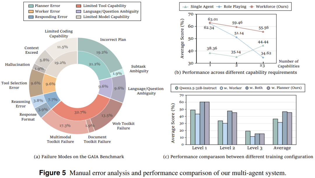 跨能力维度维持稳定:Workforce 框架在各个能力维度都展现出优势,无论任务需要 1 种、2 种还是 3 种以上的能力,Workforce 都能保持稳定的性能表现,而单智能体方法在多能力任务上出现显著性能下降。