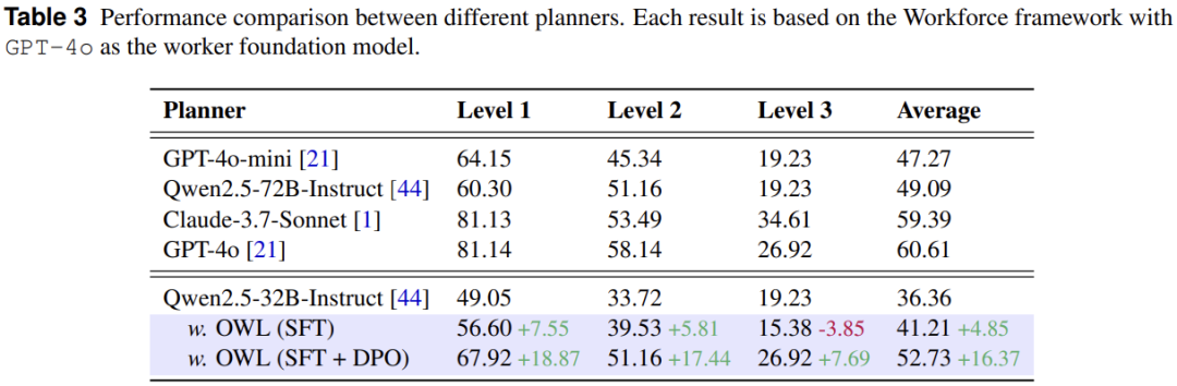在 OWL 训练方法效果验证方面,OWL 的训练设计使 Qwen2.5-32B-Instruct 模型在 GAIA 上的性能从 36.36% 提升到了 52.73%,超越了未训练的 72B 模型(49.09%),并在 Level 3 任务上达到了与 GPT-4o 相当的性能(26.92%)。
