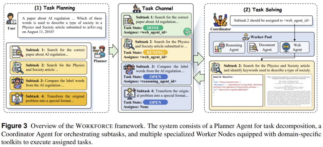 智能协调器(Coordinator Agent),作为中央协调机制,负责将子任务分配给最适合的工作节点,同时管理任务依赖关系并整合中间结果。协调器通过共享的 「任务通道」实现高效的通信管理。