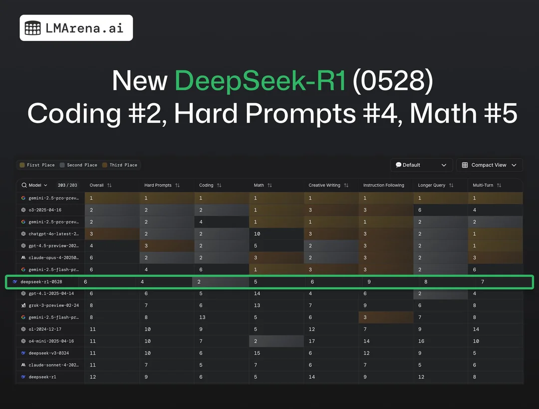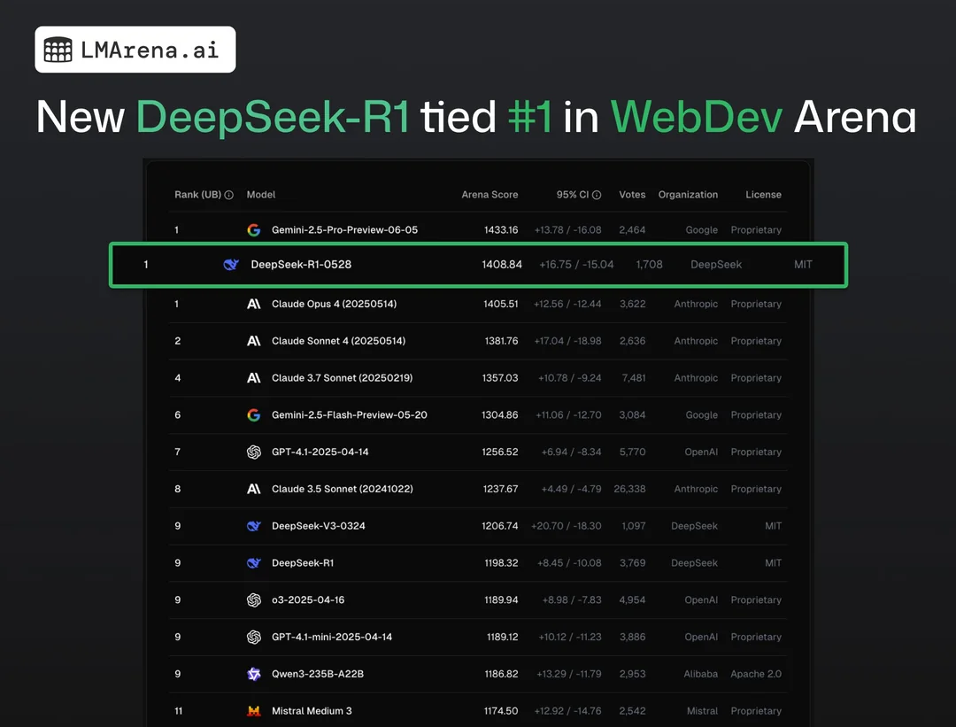 真正引起开发者社区关注的是 R1(0528)在大模型公共基准测试平台 LMArena 上的性能排名超越了多个顶尖封闭模型。