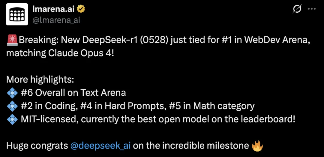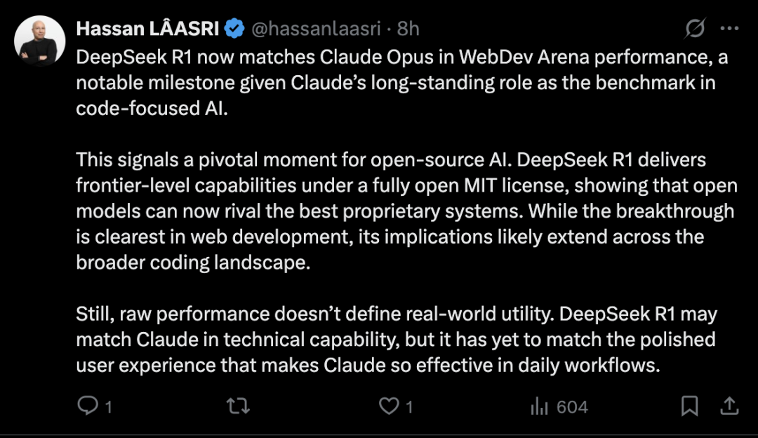 “DeepSeek R1 目前在 WebDev Arena 性能上与 Claude Opus 匹敌,鉴于 Claude 长期以来作为代码型 AI 基准的地位,这是一个值得注意的里程碑。