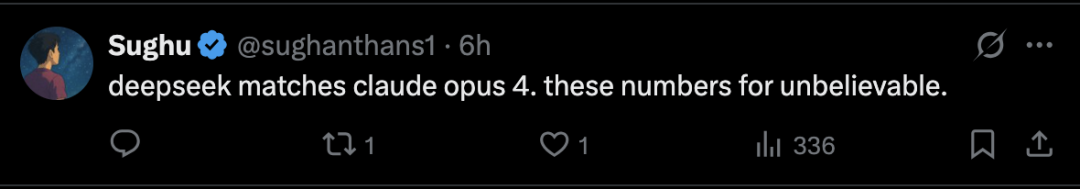 在 X 上,有 ID 名为 Sughu 的用户表示,DeepSeek 与 Claude Opus 4 匹敌。这些数字令人难以置信。
