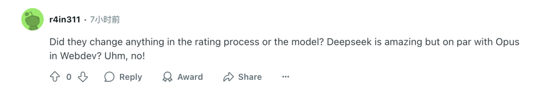 “他们(LMArena)有没有修改评级流程或模型?DeepSeek 很棒,但在 WebDev 领域能和 Opus 比肩吗?不可能的!”
