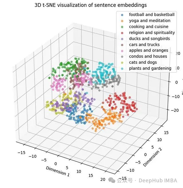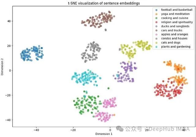 通过可视化分析可以观察到以下特征:各主题类别在空间中形成了清晰的分离边界,每个主题内部的句子呈现紧密的聚集分布,表明主题内部具有较高的相似性。虽然在瑜伽和宗教主题之间存在一定程度的重叠,但总体而言,嵌入向量表现出良好的区分性能力。