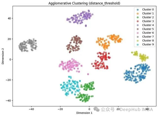 分析结果显示,轮廓系数达到0.6012,调整兰德指数为0.8686。这表明无论指定聚类数量(n_clusters)还是让算法自动发现聚类(distance_threshold),在当前数据集上的聚类结果基本一致。层次聚类算法很好地捕捉了数据的潜在结构特征。