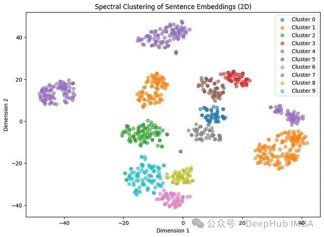谱聚类的表现相对较差,由于聚类分离度不够理想,其轮廓系数表现不佳。该算法无法为第10号聚类生成有效的标签预测,这表明谱聚类在大多数句子嵌入应用场景中并不适用。