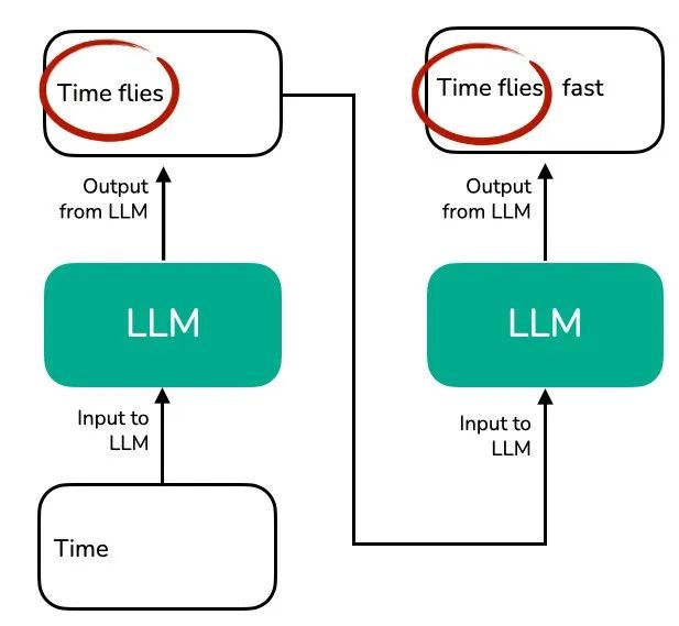 如前所述,LLM 每次生成一个 token。比如在生成了 “fast” 之后,下一个提示词就变成了 “Time flies fast”。如下图所示:
