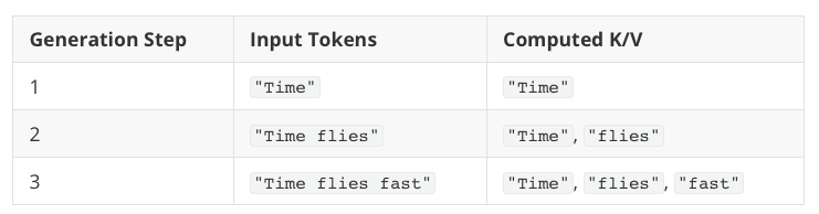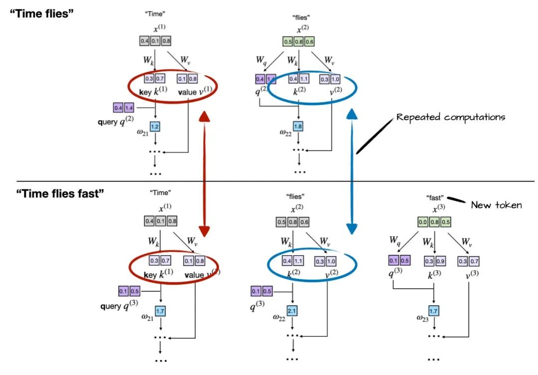 在这张图中可以看到,每次生成新 token(比如 “fast”)时,模型都重新对上下文 “Time flies” 进行编码。由于没有缓存中间的键和值向量的状态,模型每次都必须重新处理整个序列。