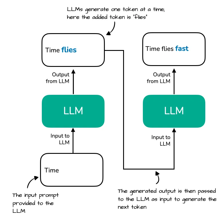 图示展示了 LLM 是如何逐步生成文本的,每次仅生成一个 token。从 “Time” 开始,生成 “flies”;接着模型会重新处理整个序列 “Time flies”,再生成 “fast”。