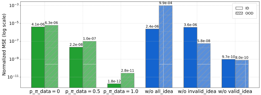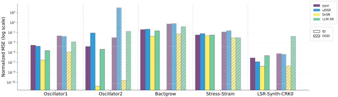 图 4 展示了 DrSR 在 ID(域内)与 OOD(域外)数据下的性能对比。可以看到:在所有任务、所有设置下,DrSR 的归一化均方误差(NMSE)始终是最低的,展现出极强的模型稳定性。其他方法(如 PySR 或 uDSR)虽然在部分任务中 ID 表现尚可,但面对 OOD 分布时误差陡升、性能骤降,而 DrSR 则表现出了 “跨场景保持鲁棒” 的能力。