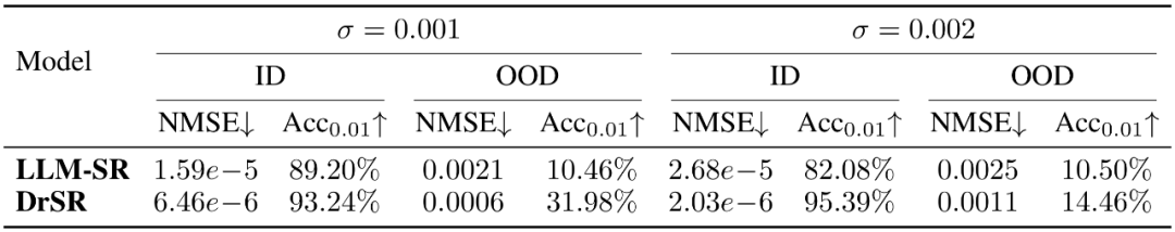 如表 2 所示,在不同高斯噪声水平下,DrSR 均显著优于 LLM-SR,展现出抗噪、抗漂移的泛化优势。