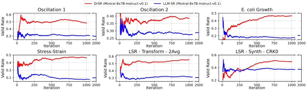 如图 3 所示,DrSR 生成的方程在语法、编译、可求值等方面的有效比例普遍高于 LLM-SR 约 10%-20%,这背后正是 “经验学习” 机制的作用 —— 模型逐步避开常见失败结构。