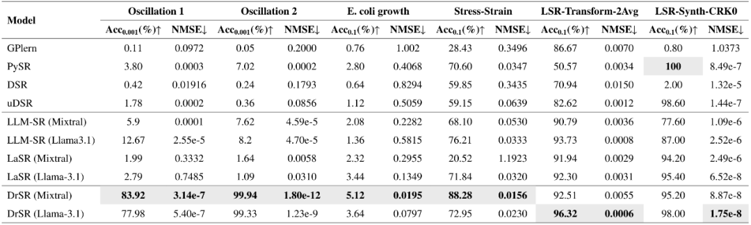 如表 1 所示,平均来看,DrSR 在 6 个任务中有 5 个取得了最高准确率(Acc)和最低归一化均方误差(NMSE)。特别地,DrSR 在非线性阻尼振荡系统建模任务(Oscillation 2)上达成了近乎完美的 99.94% 准确率,误差低至 1.8e-12,显著优于所有基线方法。