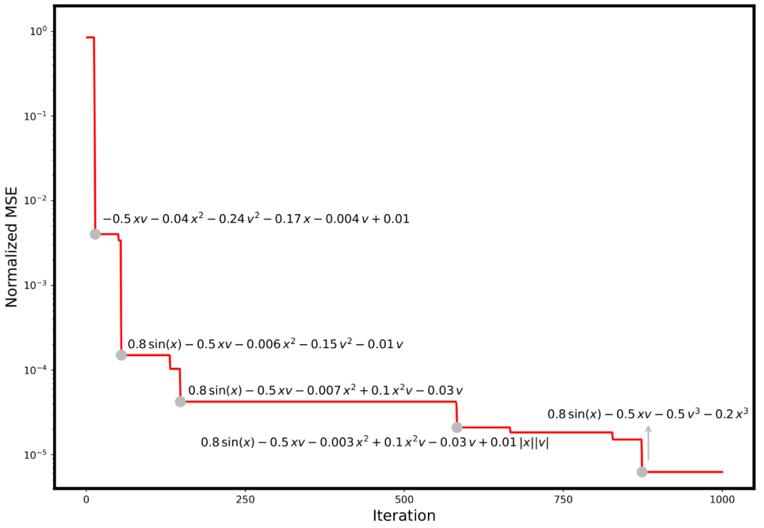 为了更直观地展示 DrSR 的 “类科学家” 建模过程,研究团队以非线性阻尼振荡系统建模任务为例,绘制了其在 1000 次迭代过程中的方程演化轨迹,如图 6 所示。