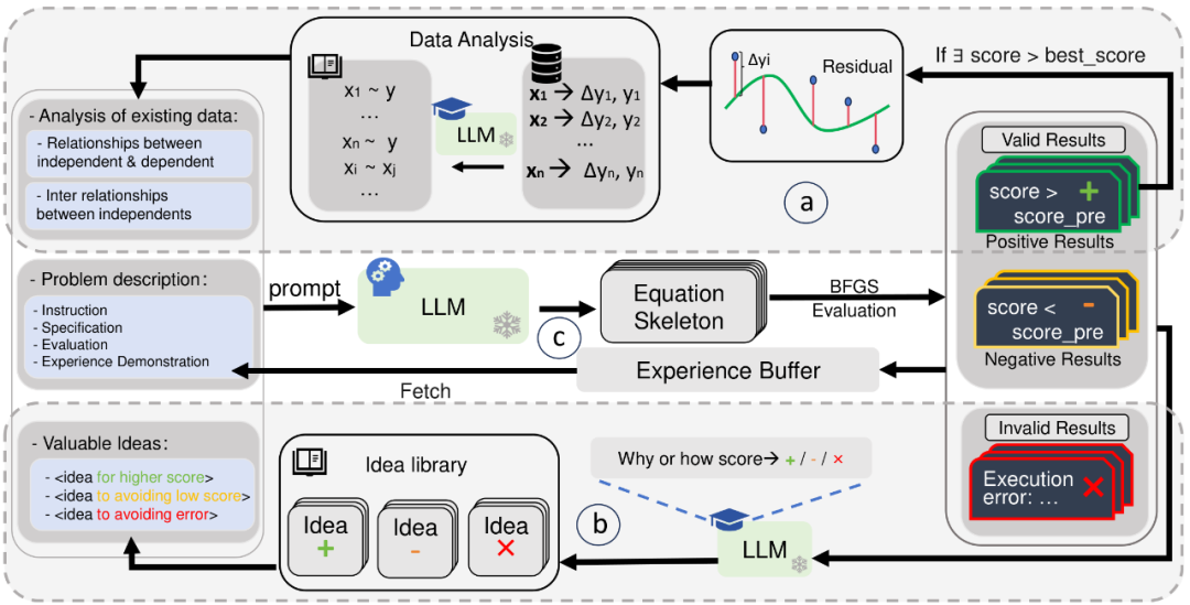 数据分析 → 提示引导 → 方程生成 → 评估打分 → 经验总结,如此循环。每一次生成,模型都在积累知识、修正路径,从 “盲目试探” 走向 “有的放矢”。