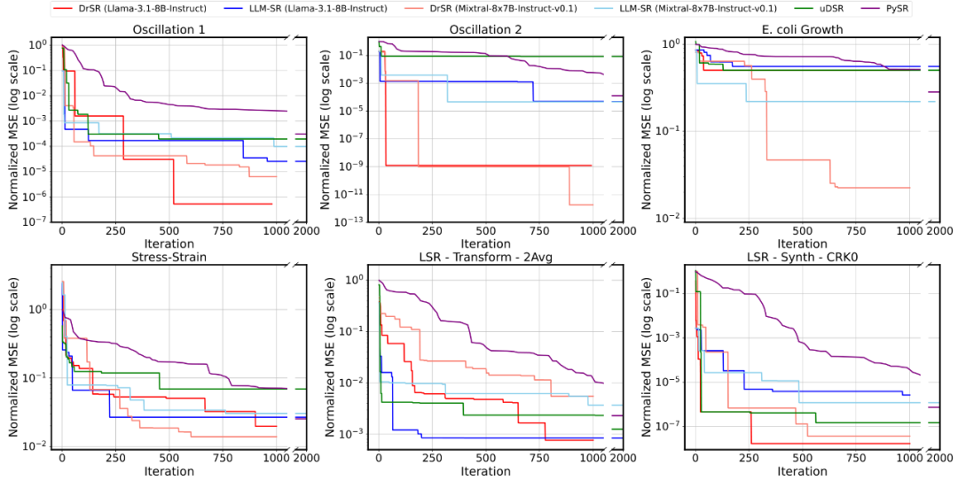 从图 2 可以看到,DrSR 在几乎所有数据集上都以更快速度达到更低的误差。在初期迭代阶段,其误差下降趋势也更稳定,不容易陷入振荡或卡顿,这说明 DrSR 的双推理策略能更有效引导方程生成方向,从而减少无效尝试次数。