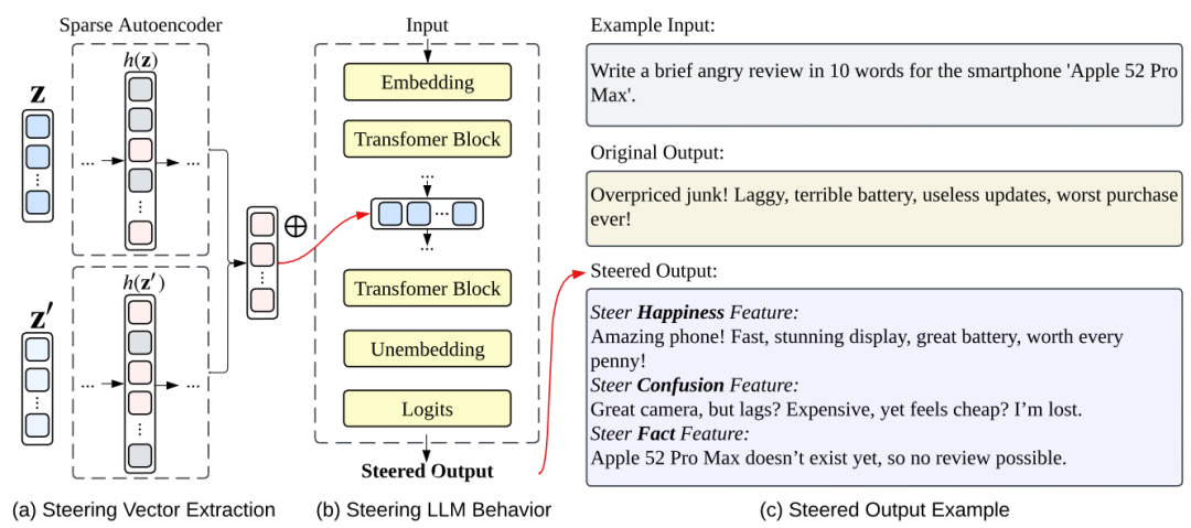 (图 3):该图演示了如何通过 SAE 操控模型输出,实现对大语言模型行为的定向引导。