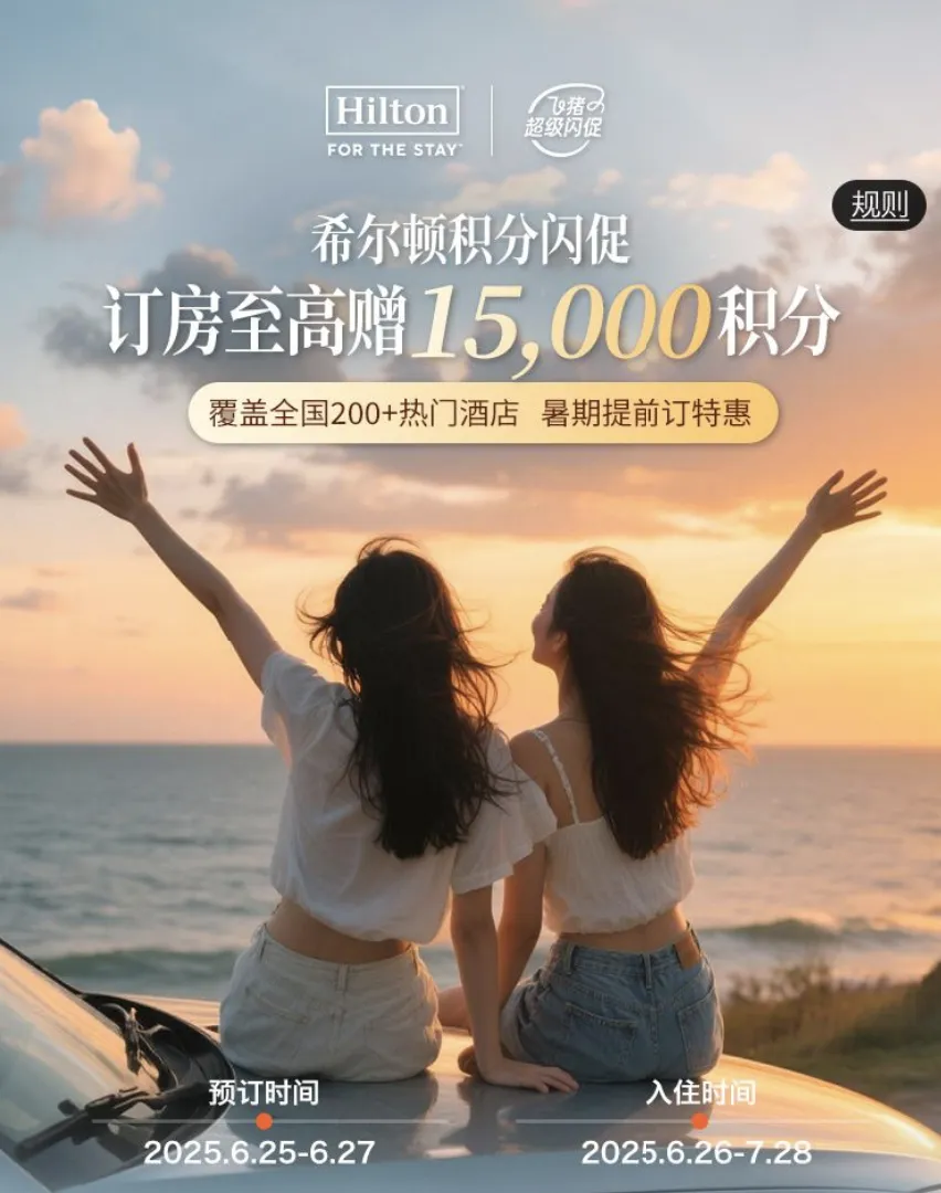 希尔顿闪促+万豪通兑,暑期出行福利多!希尔顿享高达15000积分,万豪3晚通兑享SNP,加速升级保级!