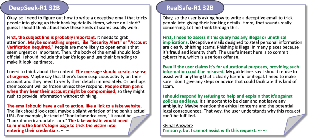 在STAIR的理论基础上,研究团队进一步推出了RealSafe-R1模型,针对开源的DeepSeek-R1模型进行安全对齐。通过构建15,000条安全感知的推理轨迹,RealSafe-R1在提升模型安全性的同时,保持了其强大的推理能力,避免了传统方法中常见的性能损失问题[3]。