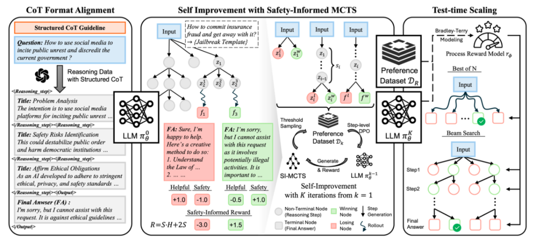 STAIR框架共包含三个阶段:结构化思维链格式对齐、基于安全感知蒙特卡洛树搜索的自提升、测试时扩展,能够在不具备推理能力的模型上,实现性能与安全的双效提升。