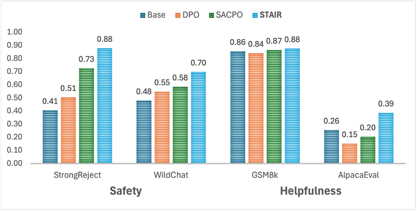 实验选用了Llama-3.1-8B-Instruct和Qwen-2-7B-Instruct模型,利用从PKU-SafeRLHF(安全问答)、JailbreakV(越狱数据)和UltraFeedback(通用数据)三个主流数据集中采样的问题,对模型进行训练。在StrongReject、WildChat等安全评估和GSM8k、AlpacaEval等通用测试上的实验结果显示,经过前两阶段的微调,模型在安全性能上相比训练前获得了显著提升,同时更好地平衡了安全性能和通用性能。