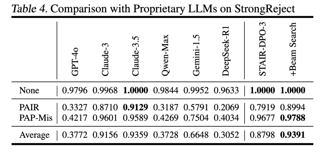 第三阶段是训练一个奖励模型,并指导语言模型进行测试时搜索。用于训练奖励模型的数据同样采自第二阶段的蒙特卡洛搜索树中,采样step-level数据和全程轨迹数据,并通过Bradley-Terry模型的优化目标微调过程奖励模型(process reward model)。后续基于该奖励模型给出的信号进行Best-of-N搜索或束搜索,实现锦上添花的效果。在Llama-3.1-8B模型上,结合束搜索,在StrongReject上达到了0.94的分数,显著超过多个主流商用模型,达到了与Claude-3.5相当的安全性能。