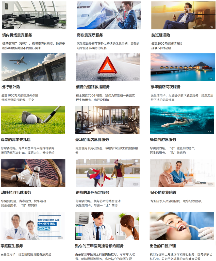 需要提醒的是,豪华白金卡与标准白金卡除了上文提到的权益差异外,民生银行还给与了豪华白金卡更多的权益(年费高是有道理的)。豪华白金卡可以获得1800个民生银行信用卡权益积点,可自由兑换各项权益,包括机场高铁贵宾厅、酒店、运动健身、健康医疗等礼遇: