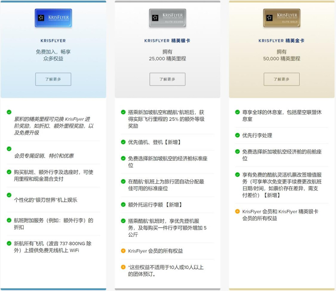 可以看到,注册即为KRISFLYER会员,随着精英里程的累积,可升级到银卡和金卡会员。而从银卡开始,就可以享受优先值机、登机以及额外行李额等权益。如果升级到金卡,则还能享受新航全球贵宾厅,包括星空联盟贵宾厅。