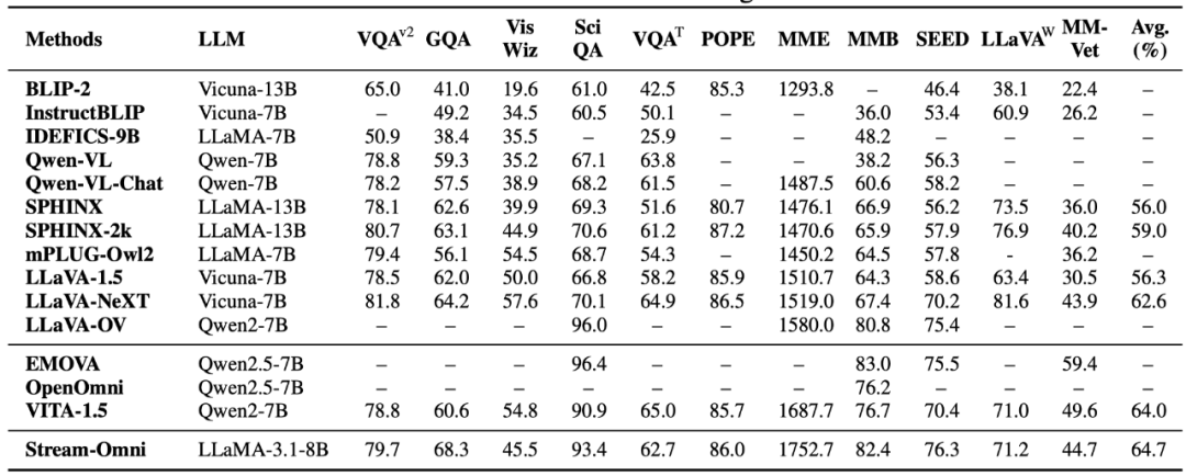 Stream-Omni和相同规模和数据量级的视觉大模型取得相当的表现。