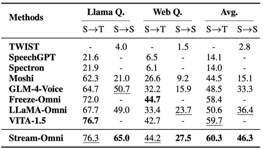 在事实性的语音交互上,Stream-Omni相比于现有方法具有优势,源于层级维度的语音文本映射将LLM的文本能力迁移到语音模态上。