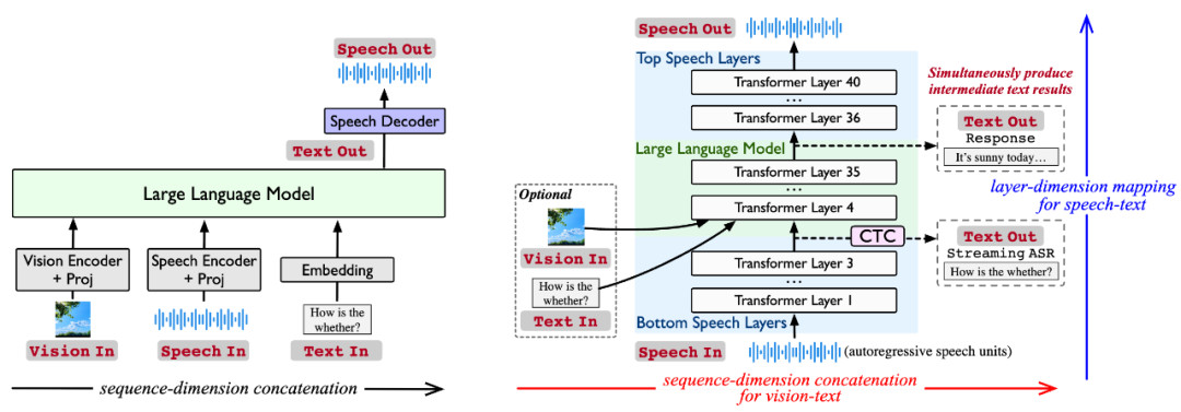 GPT-4o式的多模态大模型(LMMs)展现出在文本、视觉和语音模态上的全能能力,其在线语音服务还能在语音交互过程中同步提供中间文本结果(即用户输入和模型响应的转录内容),为用户提供“边看边听”的灵活交互体验。因此,如何构建支持文本、视觉和语音三种模态的多模态大模型成为近期研究热点。现有的多模态大模型通常利用多个编码器提取各个模态的表示,然后将各模态表示沿序列维度拼接并输入至大语言模型基座中以生成回复。这些基于拼接的方法简化了模态集成过程,但它们在很大程度上依赖大规模数据,以数据驱动的方式学习模态对齐。此外,这种基于拼接的维度对齐方式缺乏足够的灵活性,无法像 GPT-4o 那样在语音交互过程中同时生成中间文本结果。