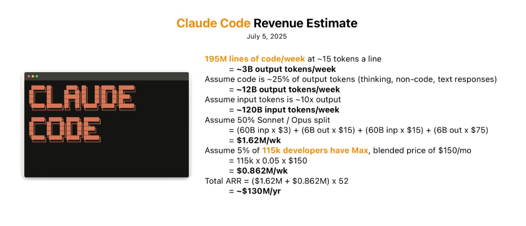 当然,这个推断基于一系列假设,包括「每行代码大约产生 15 个 token」「 纯代码输出只占总输出 token 的 25%」「 输入 token 的量大约是输出 token 的 10 倍」「模型使用量中,50% 是 Sonnet 模型,50% 是 Opus 模型 」「 11.5 万名开发者中有 5% 订阅了 Max 计划 」等,所以实际结果可能存在一定偏差。