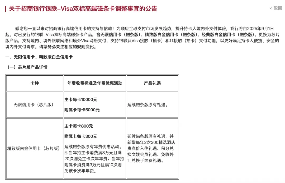 上周,招商银行信用卡发布Visa双标高端磁条卡调整事宜的公告,无限卡、经典版白金卡、精致版白金卡将更换为芯片版。