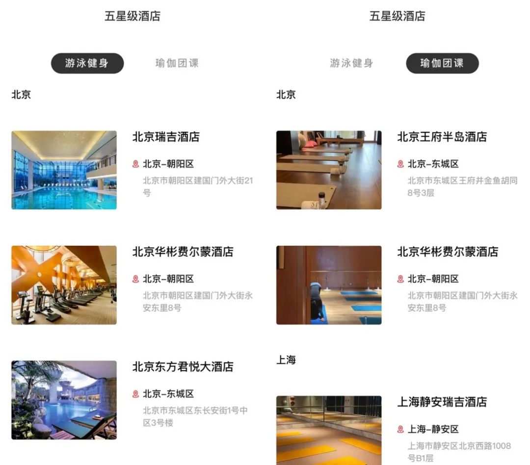 狗熊看了一下,现在仅支持北京、上海、广州、深圳的酒店,游泳健身和瑜伽团课的合作酒店不尽相同,比如北京只有华彬费尔蒙同时支持两种预约,其他的都是只合作了一项。