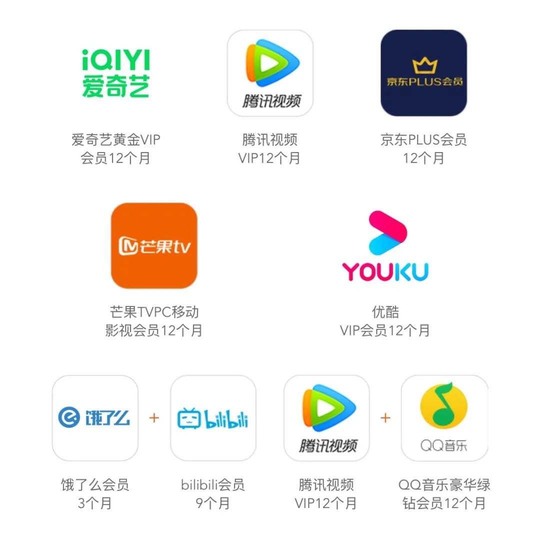 礼品有:京东E卡 20 元、饿了么外卖代金券 20 元、滴滴打车快车 30 元代金券、盒马鲜生 30 元礼品卡、爱奇艺视频黄金会员月卡、优酷土豆黄金会员月卡、腾讯视频 VIP 会员月卡、芒果 PC 移动影视会员月卡。