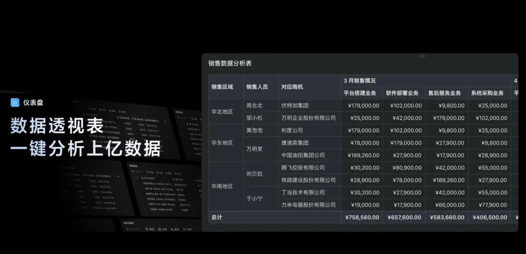 其次在应用构建方面,多维表格全新发布了「应用模式」,只需「拖拉拽」即可快速构建销售、人力、电商等业务系统,无需代码或采购外部工具;还新增透视表功能,支持跨表分析上亿行数据,并集成切片器和「Top N」筛选,实现实时数据钻取与可视化呈现。