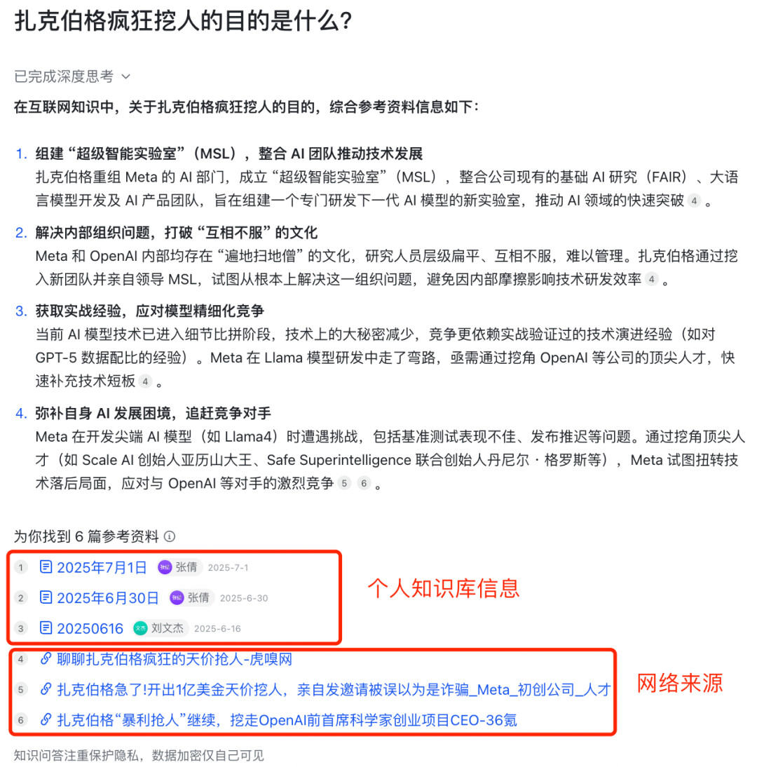 我们还可以启用「联网搜索」和「上传文件」功能。比如开启「联网搜索」按钮,问它扎克伯格疯狂挖人的目的是什么,它先查看个人知识库里的参考资料,然后搜索互联网上的消息,再对此进行整合。