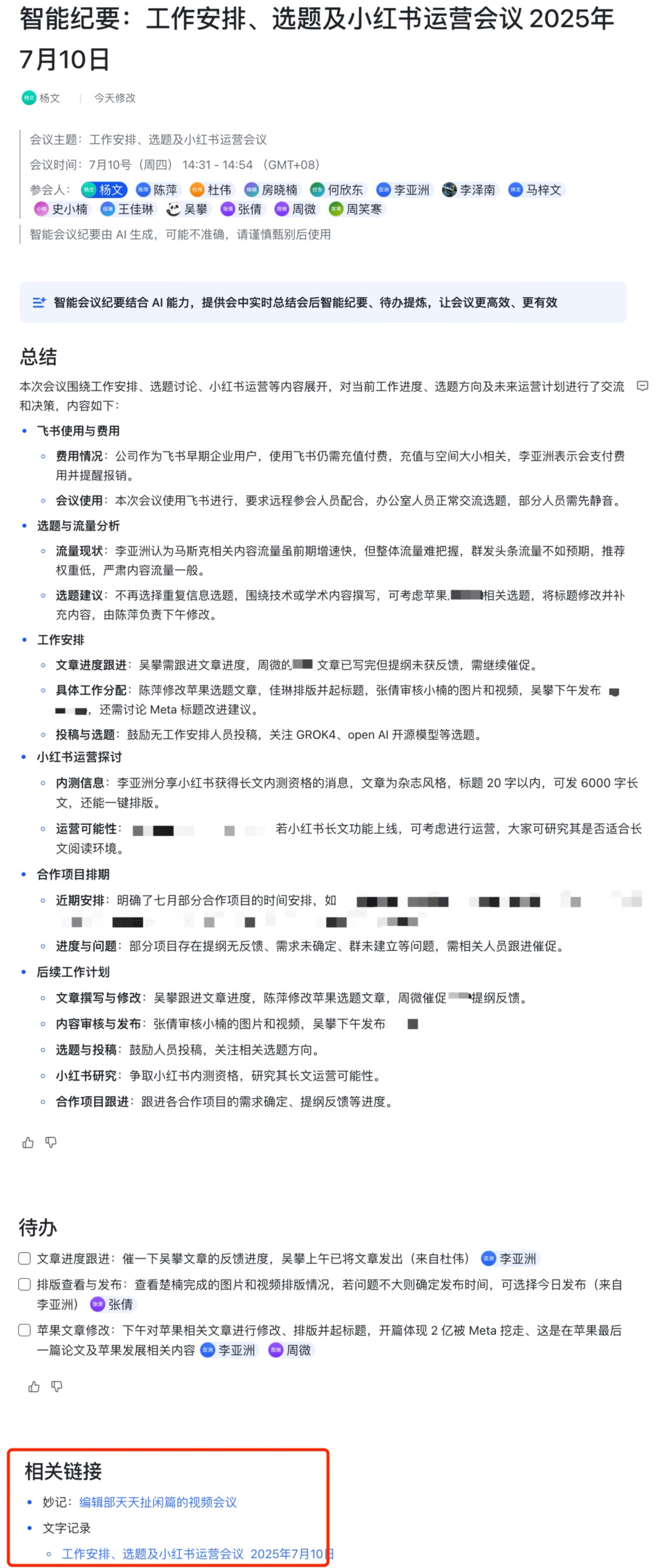 开完选题会,飞书立马就生成一份智能纪要,总结会议内容,并精准提取待办事项和责任人,还给出了相关链接方便回溯。