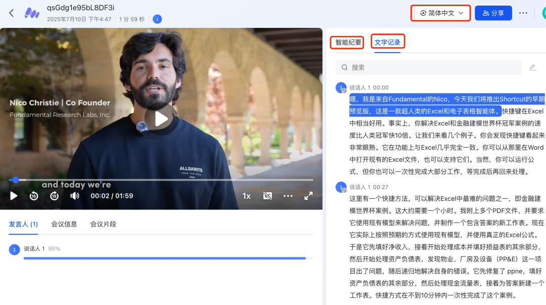 有了飞书妙记,直接上传视频,它咔咔一顿操作,就能给出详细的文字记录和智能纪要,选择「源语言」还能一键翻译。