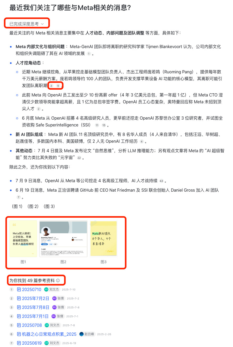 飞书知识问答立马进行深入检索模式,把我可访问的 2417 个「知识点」从头扒到尾,并按照参考信息创建时间倒序整理,确保关键信息前置,如人才挖角、内部问题、团队组成等。