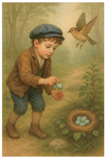 “你不能这么残忍,把可怜的鸟妈妈所有的小鸟都抢走。做个好孩子吧,答应我别再碰那个鸟巢了。”