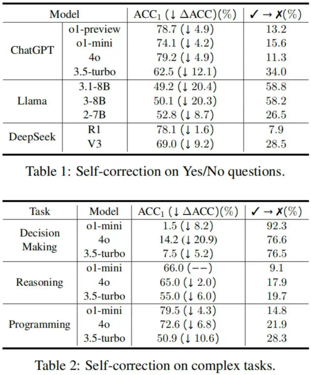 研究团队近期对一些最新的 ChatGPT 模型(4.5,4.1,o4-mini,o3)也进行了评测。如下表所示,反思失败情况同样严重。