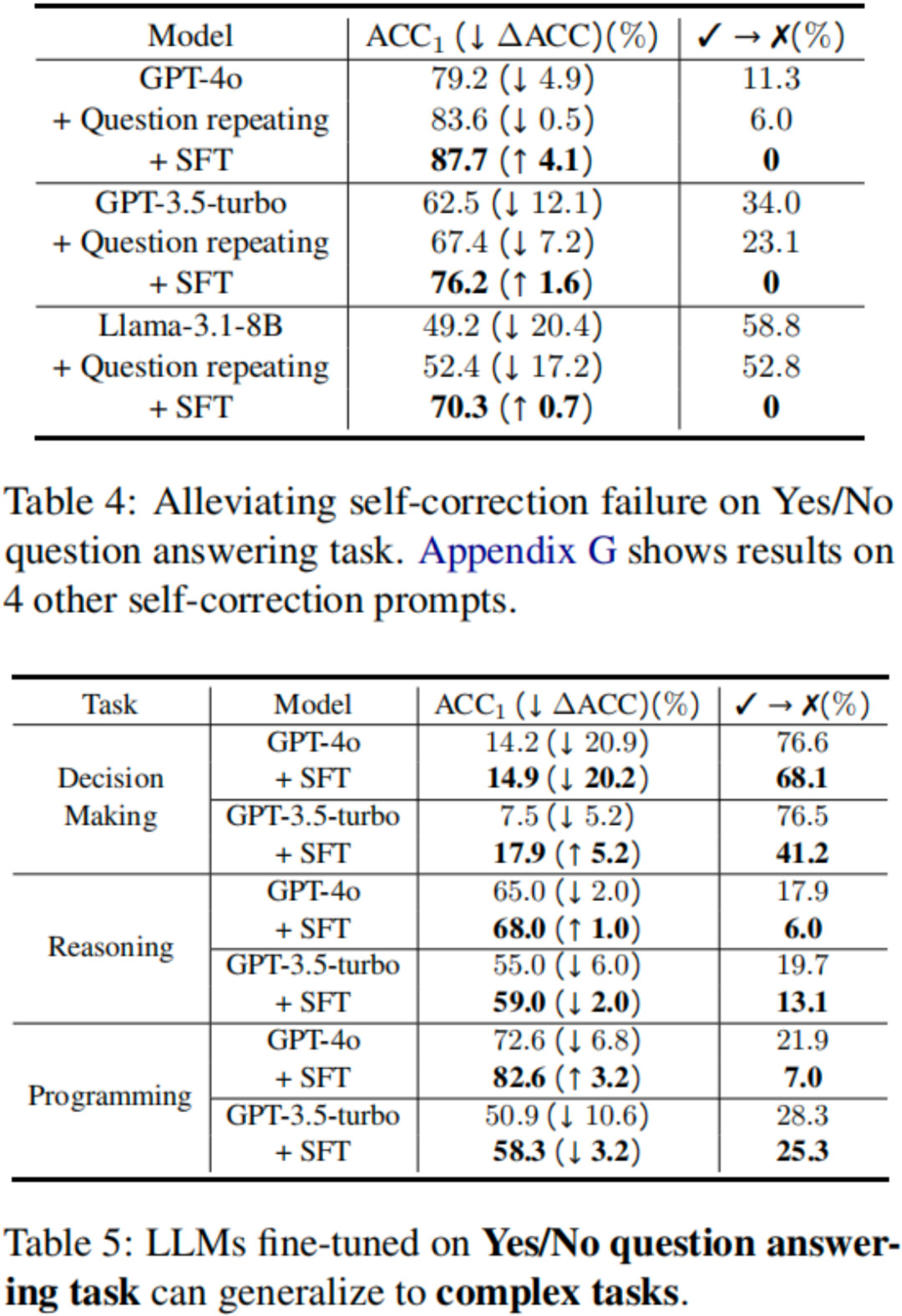 基于这些发现,研究团队提出了两种简单有效的缓解策略:一是**问题重复**,即在反思提示语后附上初始问题,引导LLMs维持对原始问题的关注;二是**少样本微调**,通过少量样本(4-10个)对模型进行微调,纠正其反思失败这种异常行为。实验结果表明,这两种策略均能有效缓解反思失败,其中少样本微调的效果更佳,并且在简单任务上的纠正效果可以泛化到复杂任务上。