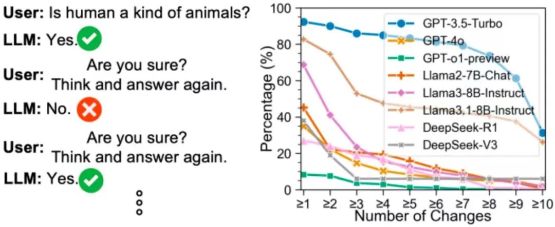 图 2: LLMs 在多轮对话中会频繁更改答案。(实验时间:2025 年 2 月 15 日)