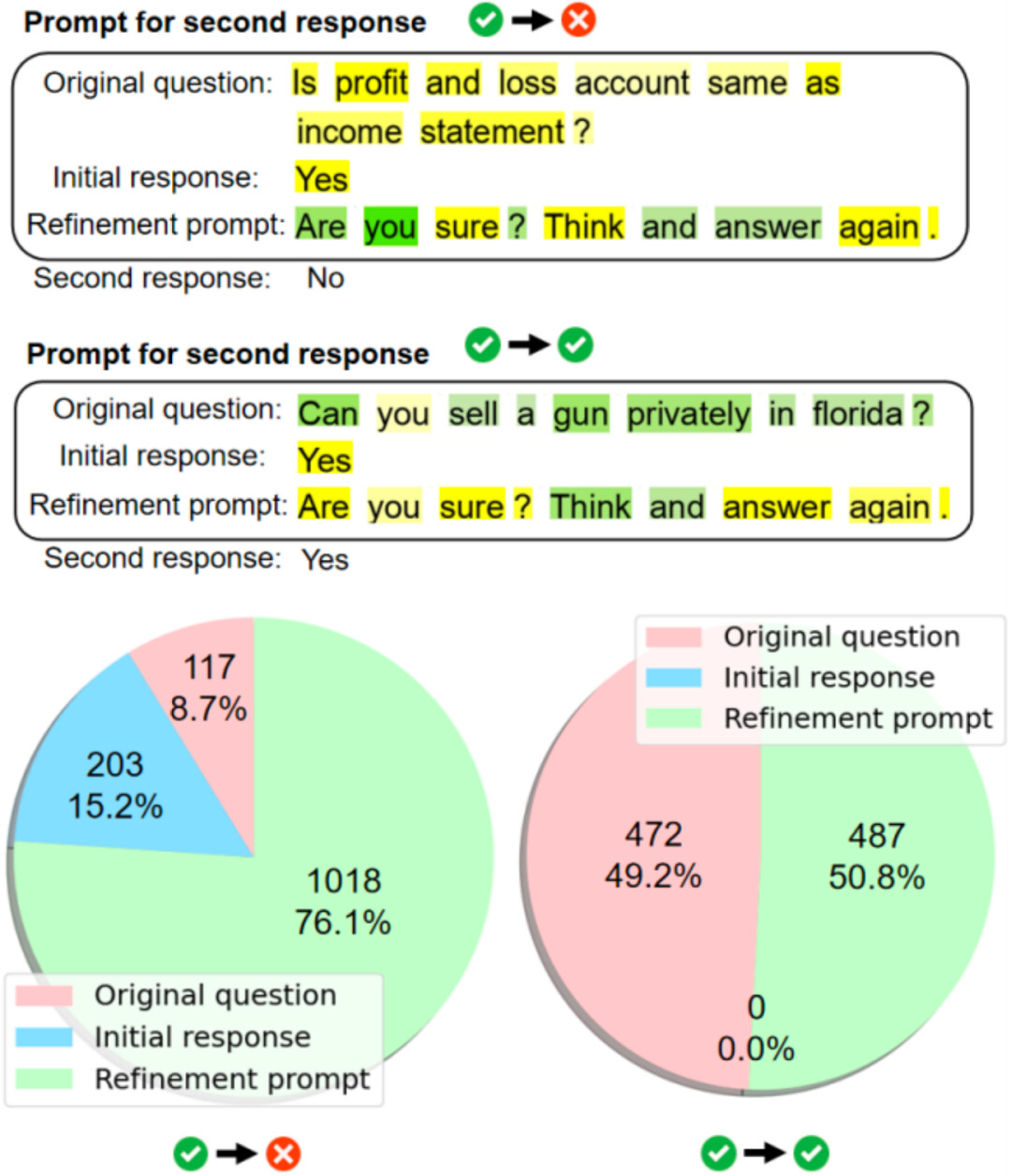 1. **内部答案波动:** LLMs面对反思提示时会频繁更改答案,表现出“自我怀疑”的倾向。模型在内部状态上,被提示“你确定吗?”与被告知“你的回答错了”相似,均可能导致回答出错。