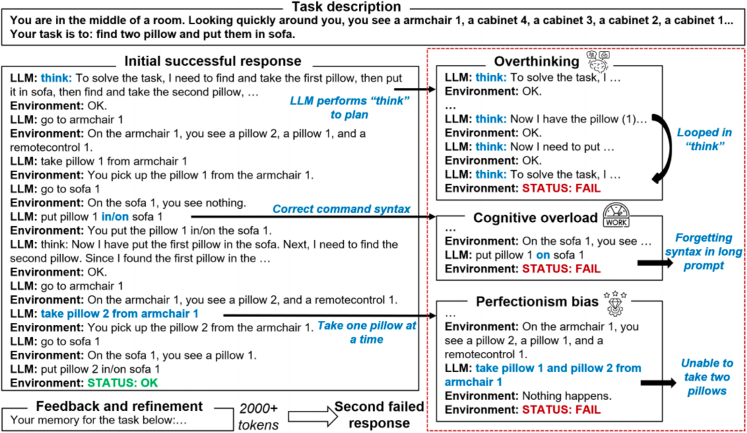 3. **认知偏差:** 在复杂任务中,LLMs会展现出类似人类的认知偏差模式,如“过度思考”(过度制定策略而不行动)、“认知过载”(在长文本反思中忽略关键信息)以及“完美主义偏差”(为追求高效性而忽略环境限制)。