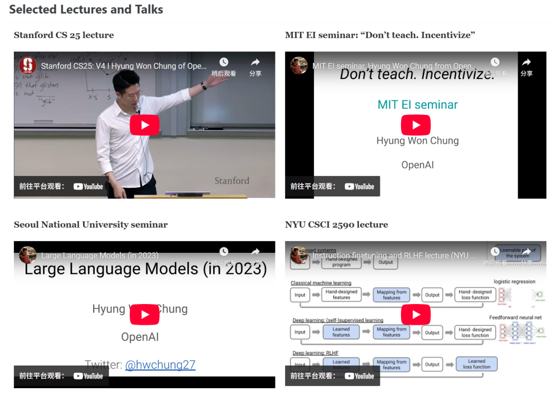 Hyung Won Chung 还在多个重要场合分享洞见,包括斯坦福 CS25 讲座广受大家好评。