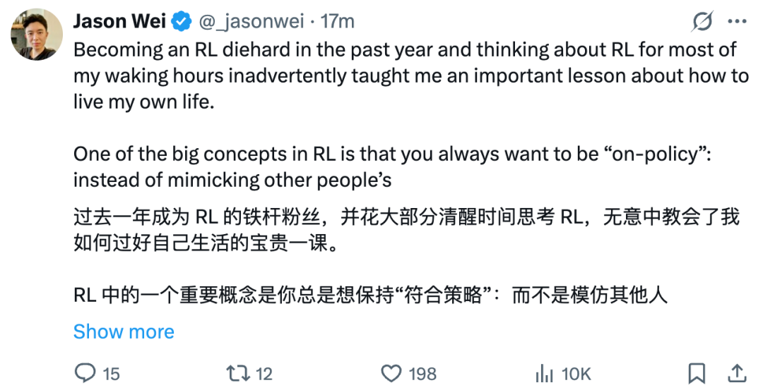 值得注意的是,在跳槽传闻传出后,Jason Wei发布了一篇关于“同策略(on-policy)强化学习”的推特,探讨了其在人生中的应用。他提出,与其模仿他人成功轨迹,不如采取自己的行动并从环境中学习。他认为,如同强化学习比监督微调更能帮助语言模型解决数学题一样,人生早期可通过模仿学习(如学校教育)引导,但要超越前辈,则需要进行“同策略”的强化学习,即走自己的路,承担风险并从中获得回报。他以自己审阅数据、进行消融研究等为例,阐述了发挥自身热情和优势的重要性。